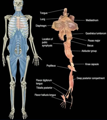 And here’s where it gets even more interesting: the psoas is the only muscle that connects the spine to the legs, which makes it essential for running and survival. In an emergency — whether real or perceived — this muscle is one of the first to engage. It helps us run, curl up, freeze, or brace. That’s why author Liz Koch refers to it as the "muscle of the soul" and talks about the fear reflex — a deep, primal pattern of curling inward for protection.