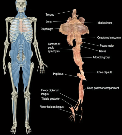 The deep fascia chain which the psoas belong to, starts at the foot, and connects to the inner thighs, pelvis, psoas, diaphragm, heart, and all the way to the tongue echo the pathways of the kidney meridian, the organ linked to the Fear and survival in TCM. It’s no wonder that the psoas has been called the “muscle of the soul.”