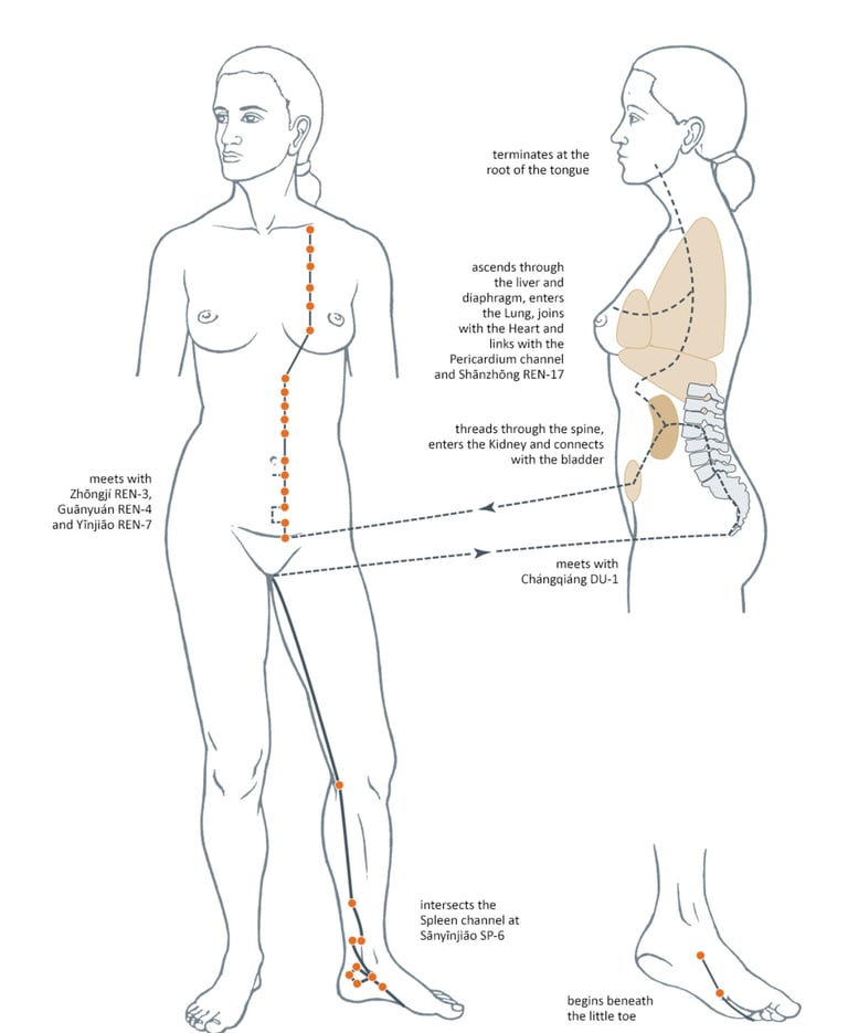 Kidney channel- starting at the feet, ascending along the medial line of the leg, all the way up through the lower spine, connecting the pelvic area, and up to the tongue.